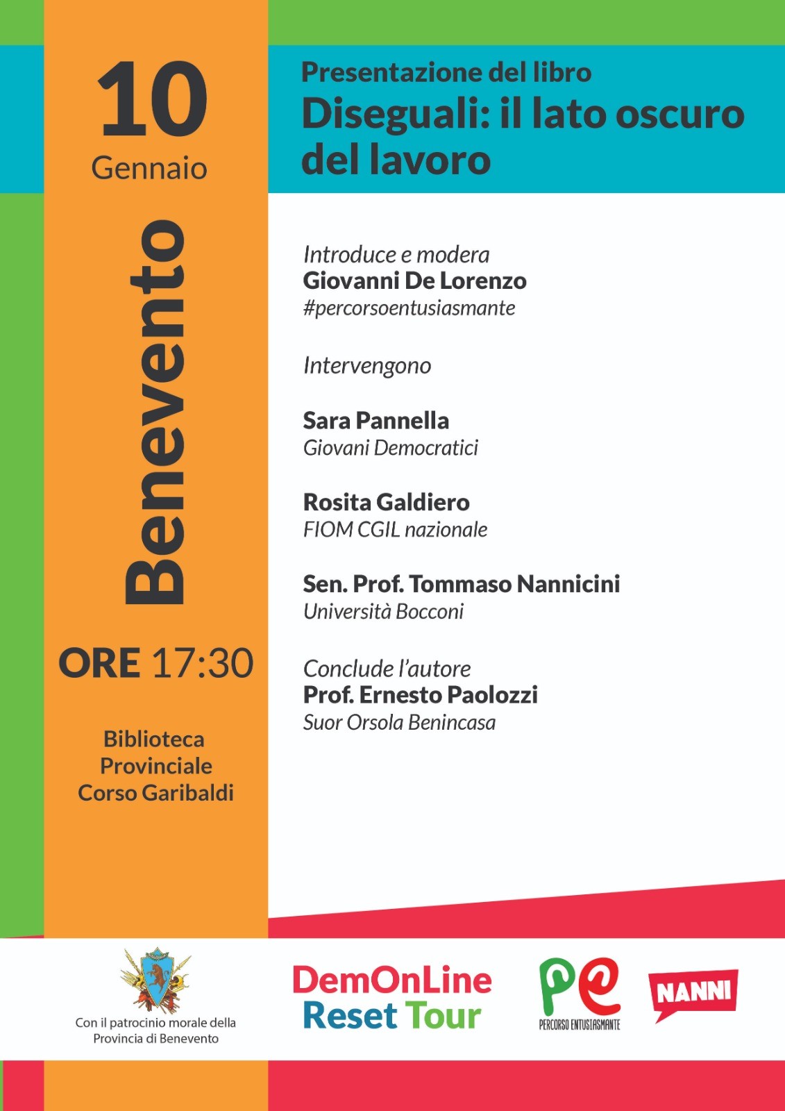 Appuntamento, quindi il 10 gennaio a Benevento alle ore 17.30 presso la Biblioteca Provinciale, al Corso Garibaldi con la presentazione del libro di Ernesto Paolozzi e Luigi Vicinanza “Diseguali – Il lato oscuro del lavoro”, organizzata insieme all’associazione politico-culturale #percorsoentusiasmante. Introdurrà e modererà Giovanni De Lorenzo, tra gli animatori di #percorsoentusiasmante. Interverranno Sara Pannella dei Giovani Democratici, Rosita Galdiero della FIOM CGIL Nazionale ed il senatore Nannicini. Concluderà l’autore prof. Ernesto Paolozzi.