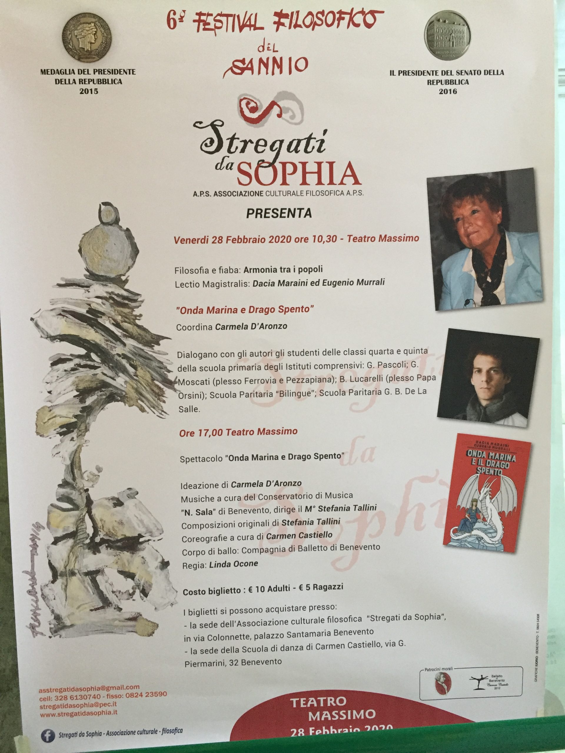Sarà l’armonia,il tema centrale della 6°edizione del Festival Filosofico del Sannio,la kermesse culturale ideata dall’associazione culturale filosofica “Stregati da Sophia”.Dal 4 febbraio al 26 marzo saranno tanti i nomi di personaggi del mondo della cultura,della scienza e della letteratura che interverranno nelle varie giornate della manifestazione.Un evento dedicato a tutti gli amanti della filosofia, ma particolarmente rivolto agli studenti. Da Paolo Crepet, a Dacia Maraini fino all’astronauta Paolo Nespoli, saranno tanti i relatori che porteranno la propria dimensione di “armonia” nel contesto del Festival.