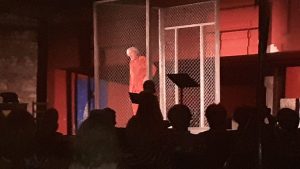 Nella fresca serata dell’Hortus Rigillo ha dato una ulteriore grande prova attoriale, un monologo ad intervalli in cui nei panni di Pound carcerato e in gabbia, da cui il titolo dello spettacolo, si è voluto imbastire una sorta di arringa difensiva in cui il pubblico diventa una sorta di triobunale e nella quale lo stesso protagonista difende strenuamente le proprie idee sul palcoscenico della storia, la sua visione profondamente anticapitalistica, l’accusa terribile al sistema finanziario e usurario motore dei conflitti e delle carneficine del ventesimo secolo. La sua vicinanza al Fascismo Pound non la rinnega ma delinea un quadro del Ventennio e delle aderenze che lo hanno tenuto al potere fino al 25 luglio.