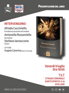 Venerdì 9 luglio, alle ore 19.00 al Tilt! Tattoo Bar Events in via Santo Spirito ad Avellino, si terrà la presentazione del romanzo “Piovono bombe” di Stefano Iannaccone, edito da Les Flaneurs. Dialogheranno con l’autore il Presidente Provinciale delle ACLI Avellino Francesco Cucciniello e la giornalista Antonella Russoniello. Leggerà alcune pagine del romanzo l’attrice Angela Caterina del Teatro d’Europa. Sarà un momento importante per Stefano Iannaccone, che finalmente torna in Irpinia per discutere del libro con i tanti lettori che, da settembre 2020 ad oggi, gli hanno sollecitato questo incontro pubblico. Le restrizioni del lockdown hanno infatti suggerito di attendere un momento ed un luogo adatto come il Tilt! Tattoo Bar Events che, grazie all’ampio spazio all’aperto, consentirà una discussione ampia e partecipata in tutta sicurezza. Già presentato al “Festival Insieme” all’Auditorium Parco della Musica di Roma, il romanzo di Iannaccone ha catturato l’interesse del pubblico e della critica grazie alla miscela di scenari e stile di tipo giornalistico – la guerra in Siria, i talent show – mescolati alla narrazione di vicende intime, sentimenti e cambiamenti radicali di punto di vista. Tra intrighi internazionali, terroristi, personaggi misteriosi e ambigui manager, si snoda una vicenda che lega due fratelli, due mondi apparentemente lontanissimi e due vite che si appartengono indissolubilmente. Stefano Iannaccone, nato ad Avellino e atripaldese d’adozione, vive a Roma. È giornalista e collabora con Panorama, Fanpage, Tag43, Notizie.it e Impakter Italia, spaziando tra inchieste, politica e tematiche ambientali. Ha scritto anche per Lettera43, La Notizia e Ilfattoquotidiano.it.