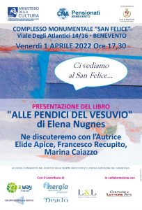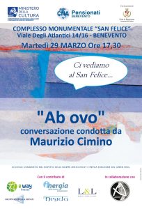 Martedì 29 marzo alle 17. 30 Maurizio Cimino sarà protagonista di “Ab Ovo”, una conversazione in collaborazione con Archeoclub di Benevento. Il 1° aprile alle 17 invece sarà presentato il libro di Elena Nugnes “Alle pendici del Vesuvio” . Ne discuteranno con l’autrice Elide Apice, Francesco Recupito, Marina Caiazzo. Gli incontri si terranno come sempre presso l’ex Convento San Felice al Viale degli Atlantici di Benevento. Ricordiamo inoltre come sia sempre possibile visitare gratuitamente la mostra internazionale dell’Arte/Studio Gallery curata dal Maestro Lanzione, tutti i giorni, dalle 9 alle 18.30; il sabato e la domenica dalle 9 alle 13.