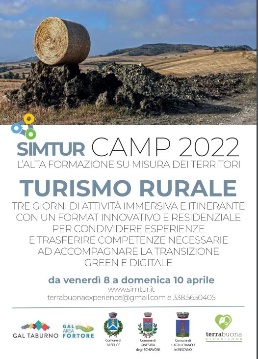 L’ATI GAL TABURNO – GAL AREA FORTORE, ha organizzato insieme alla società SIMTUR e ai comuni di Castelfranco in Miscano, Ginestra degli Schiavoni e Baselice un importante evento di animazione territoriale denominato “CAMP 2022 – l’alta formazione su misura dei territori”. Le attività si svolgeranno nei giorni 8, 9 e 10 aprile durante i quali professionisti, titolari di aziende ricettive, si incontreranno per acquisire informazioni e modalità di applicazione utili allo sviluppo territoriale del fortore. All’evento parteciperà anche all’associazione culturale Terra Buona Experience di Buonalbergo che da tempo opera sul territorio del fortore nel settore della promozione turistica.