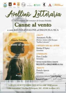 Nuovo appuntamento per la rassegna “Avellino Letteraria” ideata ed organizzata da Annamaria Picillo, direttore artistico dell’evento. Sabato 10 settembre alle 18, presso la storica dimora, Villa Amendola, sarà presentato il romanzo di Grazia Deledda, “Canne al vento”, a cura di Emanuela Sica e Luigi Anzalone.