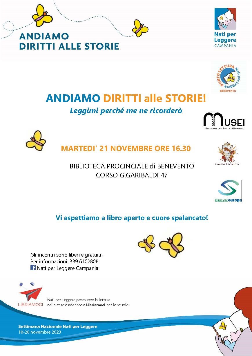 Sarà la Biblioteca provinciale di Benevento ad ospitare anche quest’anno l’incontro “Andiamo dritti alle storie! Leggimi perché me ne ricorderò”, in programma per martedì prossimo (ore 16,30), evento promosso nell’ambito della “Settimana nazionale Nati per Leggere” che, in occasione della Giornata Internazionale dei diritti dell’infanzia e dell’adolescenza, promuove in particolare il Diritto alle Storie delle bambine e dei bambini.