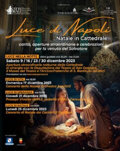 Domenica 17 dicembre ore 18:30 – Concerto della Nuova Orchestra Scarlatti, Giovedì 21 dicembre, ore 10:00 – Presepe Vivente dell’IS Isabella d’Este – Caracciolo, Lunedì 25 dicembre ore 20:30 – Concerto dei Cantori di Posillipo, Sabato 9 – 16 – 23 – 30 dicembre alle ore 20:00 e alle ore 21:30 – visite straordinarie serali alla Cattedrale di Napoli, alla Cappella e al Museo del Tesoro di San Gennaro e all’antica cappella del Tesoro Vecchio. Durata della visita 75 min circa. Prenotazione sul sito tesorosangennaro.it.