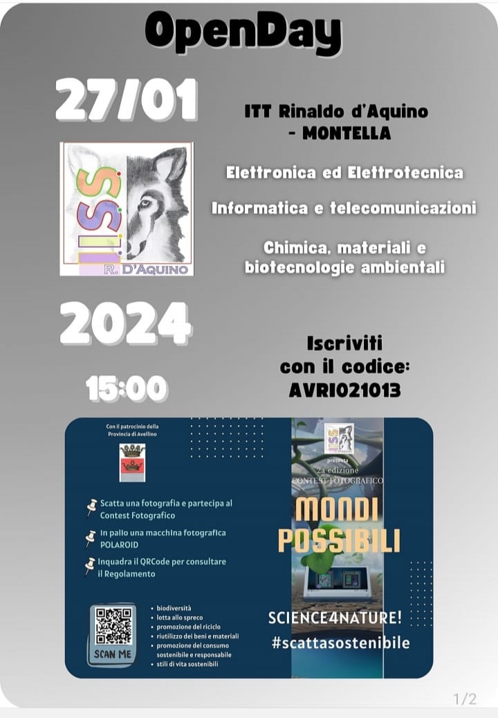 Grande occasione per i giovani irpini che, chiamati ad una scelta importante per il loro futuro scolastico, potranno avere la possibilità di iscriversi ai tanti corsi offerti dall’ I.I.S.S. “RINALDO D’AQUINO” di Montella che, in occasione dell’OPEN DAY che partirà sabato 27 Gennaio 2024 con l’ISTITUTO TECNICO TECNOLOGICO (indirizzi e percorsi di studio: Chimica materiale e biotecnologie ambientali, Elettronica ed elettrotecnica, Informatica e telecomunicazioni) aprirà le porte a tutti gli studenti e le studentesse del nostro territorio dell’Alta Irpinia.