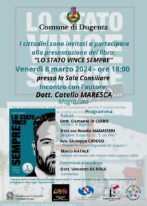 “Lo Stato vince sempre” è il titolo del libro del Magistrato Catello Maresca, che sarà presentato al Comune di Dugenta venerdì 8 marzo.