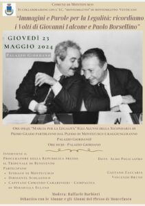 Il Comune di Montefusco, in collaborazione con l’I.C. “Montemiletto” di Montemiletto – Venticano, organizza per giovedì 23 maggio un evento significativo dal titolo “Immagini e Parole per la Legalità: ricordiamo i volti di Giovanni Falcone e Paolo Borsellino“.