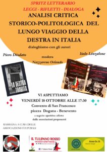Venerdì 18 ottobre alle ore 17:30 presso il convento di San Francesco in piazza Dogana a Benevento, è in programma l’evento culturale “Spritz Letterario”.