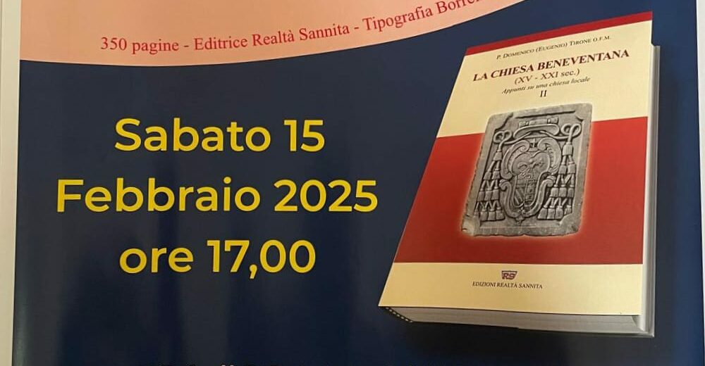 Sabato 15 febbraio, alle ore 17:00, presso l’oratorio francescano “Santissima Annunziata” di San Giorgio Del Sannio, si terrà la presentazione del libro “La Chiesa Beneventana- XV- XXI Sec.” II volume a cura di Padre Domenico Tirone, edito da Realtà Sannita. L’autore presenterà il suo nuovo libro attraverso una intervista a cura di Rita Pacillo.