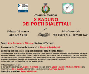 Il 29 marzo, presso la sala comunale di Torrioni, si terrà il X Raduno dei Poeti Dialettali, un evento che celebra la poesia in vernacolo e la tradizione locale. L’incontro inizierà alle ore 17:00 con i saluti del sindaco, Avv. Annamaria Oliviero, e sarà accompagnato da un’intermezzo musicale di Grazia Covino alla fisarmonica.