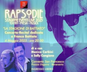 Domenica 4 maggio alle ore 20.00, con “La Stagione di Battiato” concerto-recital dedicato a Franco Battiato, scritto da Monica Carbini e curato e realizzato insieme a Sally Cangiano, continua Rapsodie 2025, la seconda edizione della rassegna di eventi live e performance artistiche, teatrali, musicali e poetiche, a cura di Monica Carbini e Test TeatroStage.