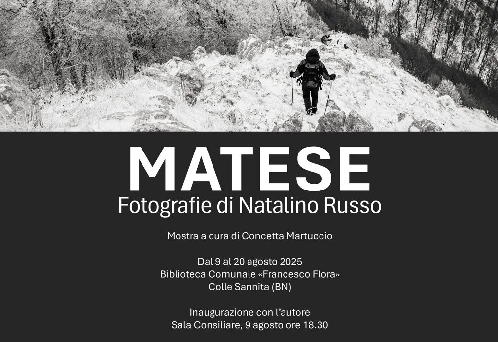 Dopo aver toccato varie città e festival in giro per l’Italia, il lavoro fotografico che Natalino Russo ha dedicato al Parco Nazionale del Matese fa tappa nel Sannio, con una nuova mostra a Colle Sannita (BN). L’esposizione sarà ospitata presso la Biblioteca Comunale «Francesco Flora» e sarà visitabile dal 9 al 20 agosto 2025. L’inaugurazione si svolgerà il 9 agosto alle ore 18.30 presso l’aula consiliare: l’autore dialogherà con Concetta Martuccio, curatrice dell’allestimento.
