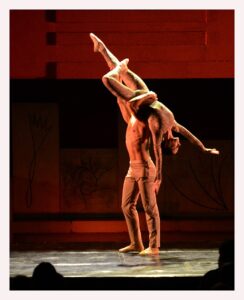 Le coreografie di Odette Marucci “Aestas” e “Hiemis Tempore” che le interpreta insieme ad Hassan Awad, sono esplosione di vita. Le stagioni si susseguono in un tumulto di colori stampati sulla pietra secolare ricordando la resistenza del bronzo e l’omogeneità della roccia in un infinito ritmo di libertà.