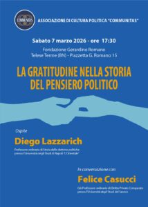 Sabato 07 marzo 2026, alle ore 17.30, l’Associazione di Cultura Politica Communitas, presso la sede legale di Telese Terme (BN), sita in Piazzetta G. Romano 15, ospiterà il seminario dal titolo “La gratitudine nella storia del pensiero politico” a cura del prof. Diego Lazzarich.