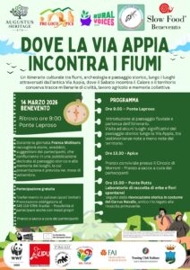 La condotta Slow Food di Benevento, in collaborazione con l’associazione La Grande Madre e la Pro Loco di Apice, con il patrocinio del Comune di Apice, WWF Benevento, Lipu, Comitato di quartiere Santa Clementina, Gruppo Archeologico Scampitella, Slow Food Colline dell’Ufita, Circolo culturale di Morroni, FAI e Touring Club Italiano, organizza per sabato 14 marzo 2026 una giornata dedicata alla Via Appia e ai luoghi in cui incontra i fiumi.