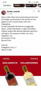 “Sono molto felice ed emozionata perché sarò al Vinitaly a presentare il mio amaro al vino Aglianico e il liquore dolce al vino Falanghina. Un altro pezzetto del Sannio si aggiunge a questa grande fiera internazionale! Spero che tutto vada per il meglio e colgo l’occasione per fare i miei migliori auguri a tutte le aziende sannite e campane che saranno presenti con i loro strepitosi vini. Ad maiora! A tutti, Buona Fiera!