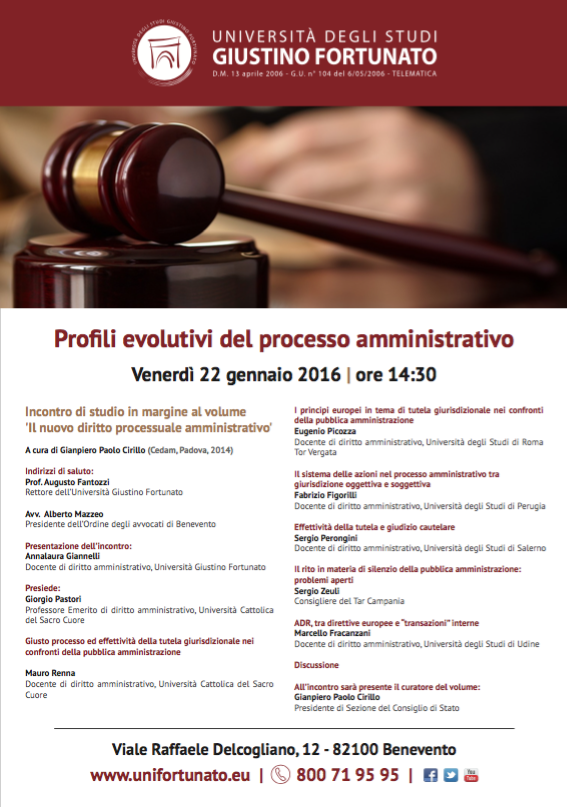 L’incontro del 22 gennaio p.v., che si terrà nell’aula Magna dell’Unifortunato di Benevento, rappresenta, dunque, una preziosa occasione per fare il punto sulle criticità dell’ordinamento vigente in tema di contenzioso dinanzi a Tar e Consiglio di Stato, nella consapevolezza della irrinunciabilità di una serie di fondamentali diritti costituzionali, primo fra tutti quello alla tutela giurisdizionale delle situazioni soggettive, ivi comprese quelle che si collocano in un rapporto di tensione dialettica con il pubblico potere. La partecipazione all’incontro comporta, per gli avvocati, l’attribuzione di crediti formativi.