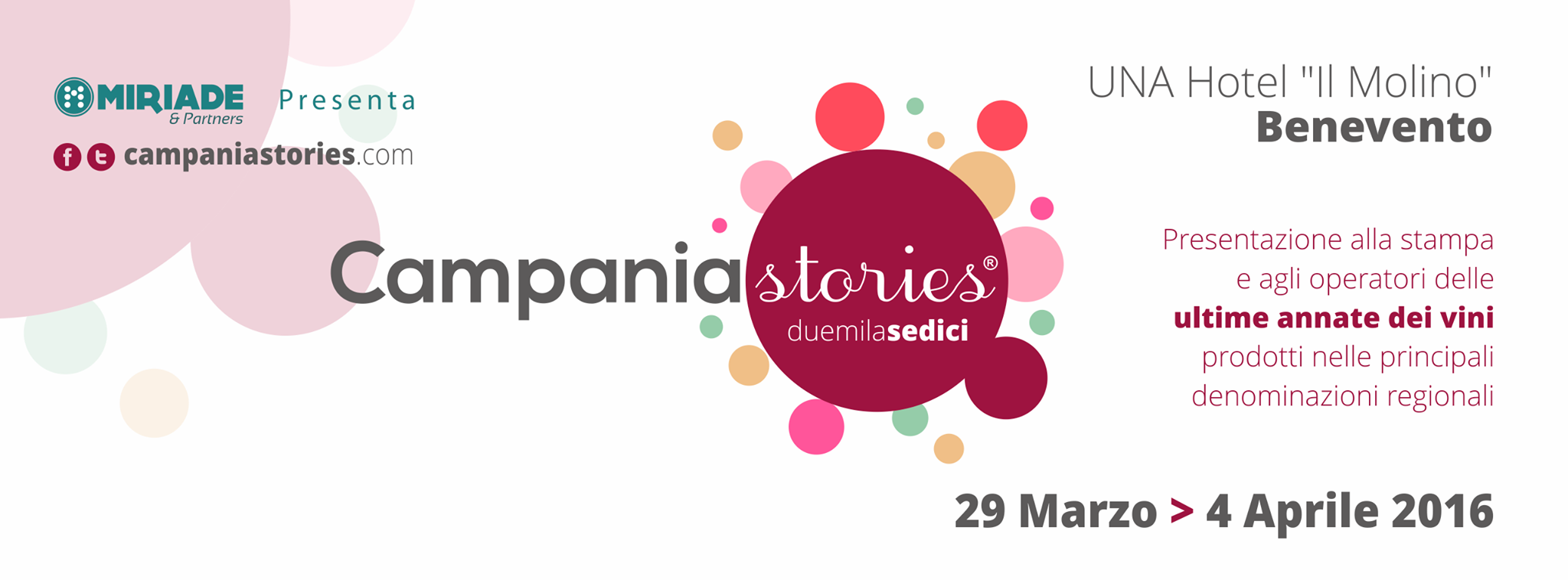 Dal 29 marzo al 4 aprile prossimi i più autorevoli rappresentanti della stampa specializzata nazionale ed internazionale saranno in Campania per prendere parte alla rassegna, promossa ed organizzata da Miriade & Partners “Campania Stories”.  70 le aziende partecipanti, un eventi d’eccellenza che può contare su centinaia di vini in degustazione, tutorial per la stampa, visite in azienda, momenti dedicati alla gastronomia d’eccellenza, momenti dedicati alle aziende e, per operatori e appassionati, seminari ed il tradizionale appuntamento conclusivo dell’evento, il Campania Stories Day, sessione di assaggio dedicata agli operatori con postazione riservata, in programma lunedì 4 Aprile.