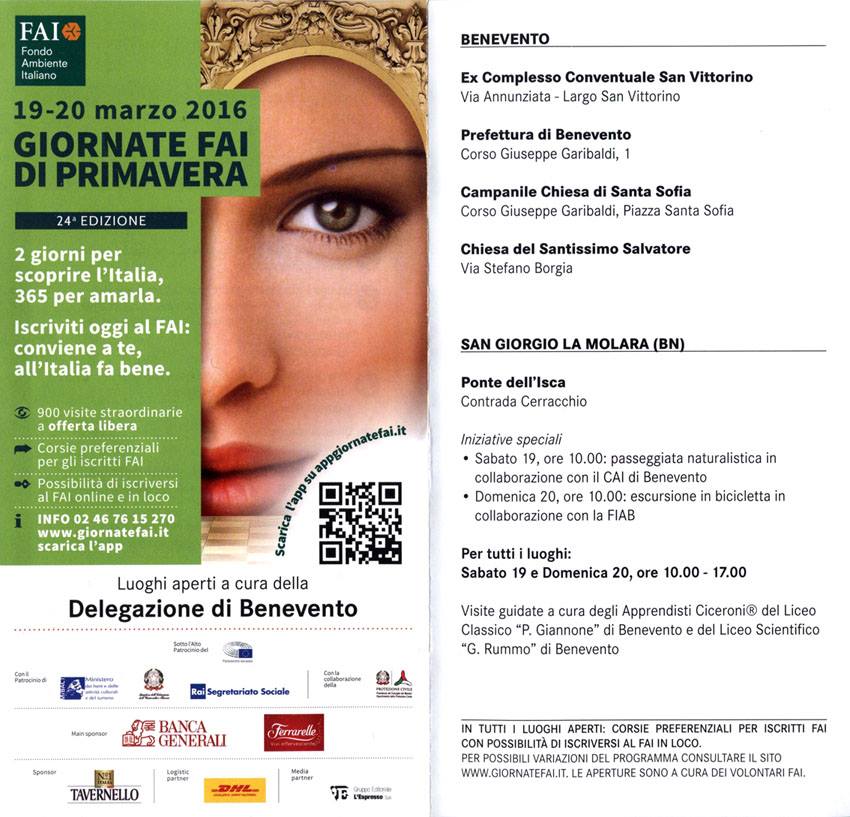 Anche Benevento aderirà all’appuntamento. I monumenti da visitare saranno: l’ex Complesso monumentale San Vittorino, la Prefettura, il Campanile della Chiesa di Santa Sofia e la Chiesa del Santissimo Salvatore. Una due giorni, dunque, alla scoperta della natura e dell’arte.