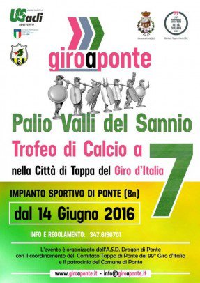 L’ASD Dragon con il coordinamento del Comitato di Tappa di Ponte del 99° Giro d’Italia e il con il patrocinio del Comune di Ponte, ha infatti organizzato il “Palio Valli del Sannio”, un torneo di calcio a sette che prenderà il via il prossimo 14 giugno.