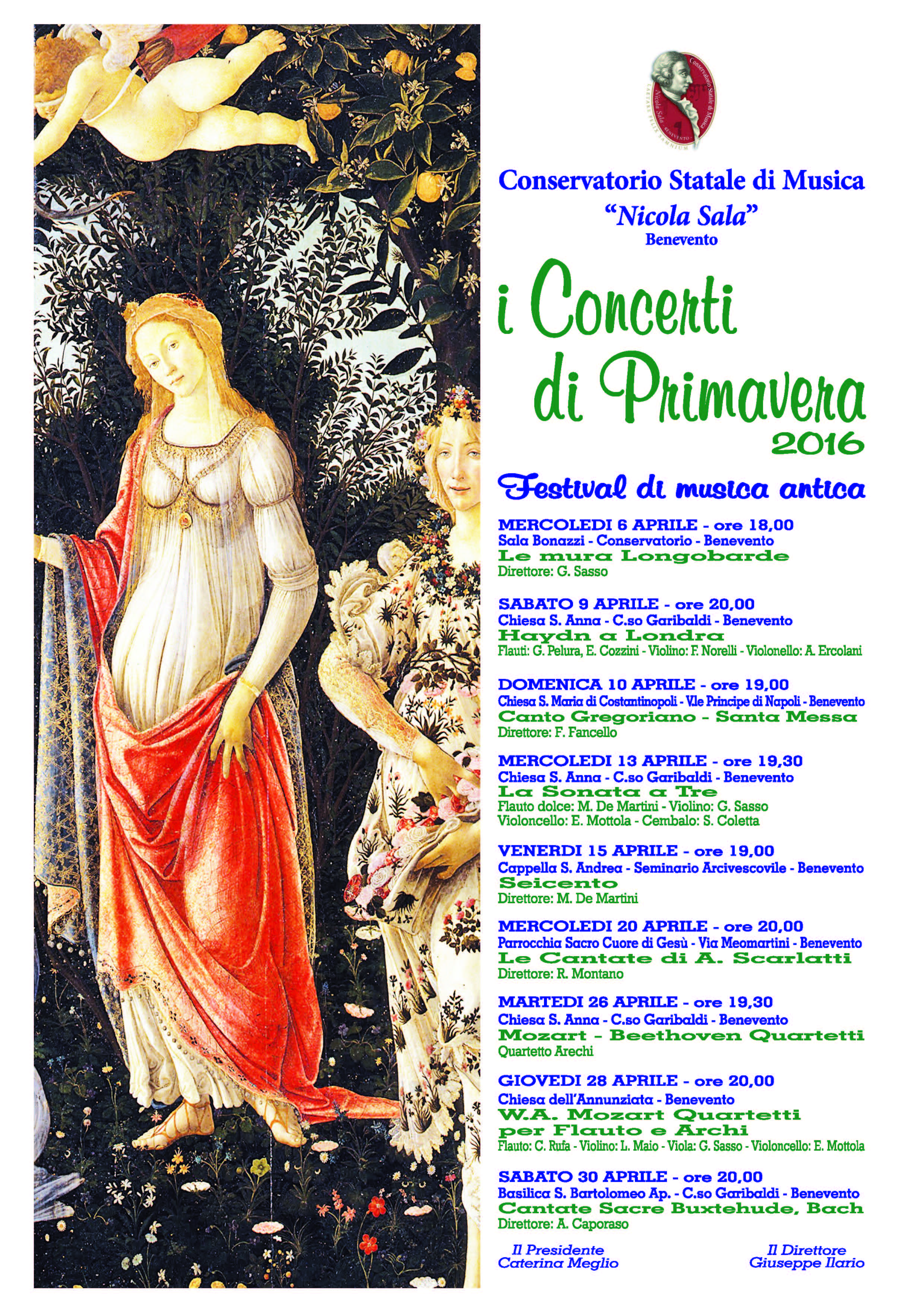 Continua con successo la Stagione Artistica de “I Concerti di Primavera 2016” per il Conservatorio di Musica «Nicola Sala» di Benevento, con il Festival di Musica Antica. Appuntamento concertistico, mercoledì 20 aprile, alle ore 20.00, presso la Parrocchia Sacro Cuore di Gesù, Via Meomartini, a Benevento, con “Le Cantate di A. Scarlatti”, con l’Ensemble diretto dal M° Rosa Montano, docente presso l’Istituzione di Alta Formazione Musicale sannita.