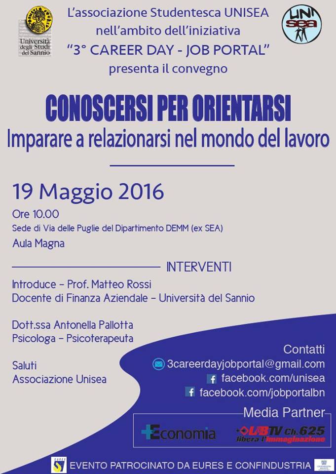 Nella giornata del 19 maggio nell’Aula Ciardiello di Via delle Puglie, a partire dalle ore 10, la psicologa e psicoterapeuta Antonella Pallotta incontrerà gli studenti nell’ambito di un seminario dal titolo “Conoscersi per orientarsi. Imparare a relazionarsi nel mondo del lavoro”. Il seminario avrà lo scopo di esaminare i comportamenti individuali per i futuri colloqui di lavoro. La giornata vedrà la partecipazione del professore Matteo Rossi di Unisannio e della vice presidente di Unisea, Ida Petrillo.