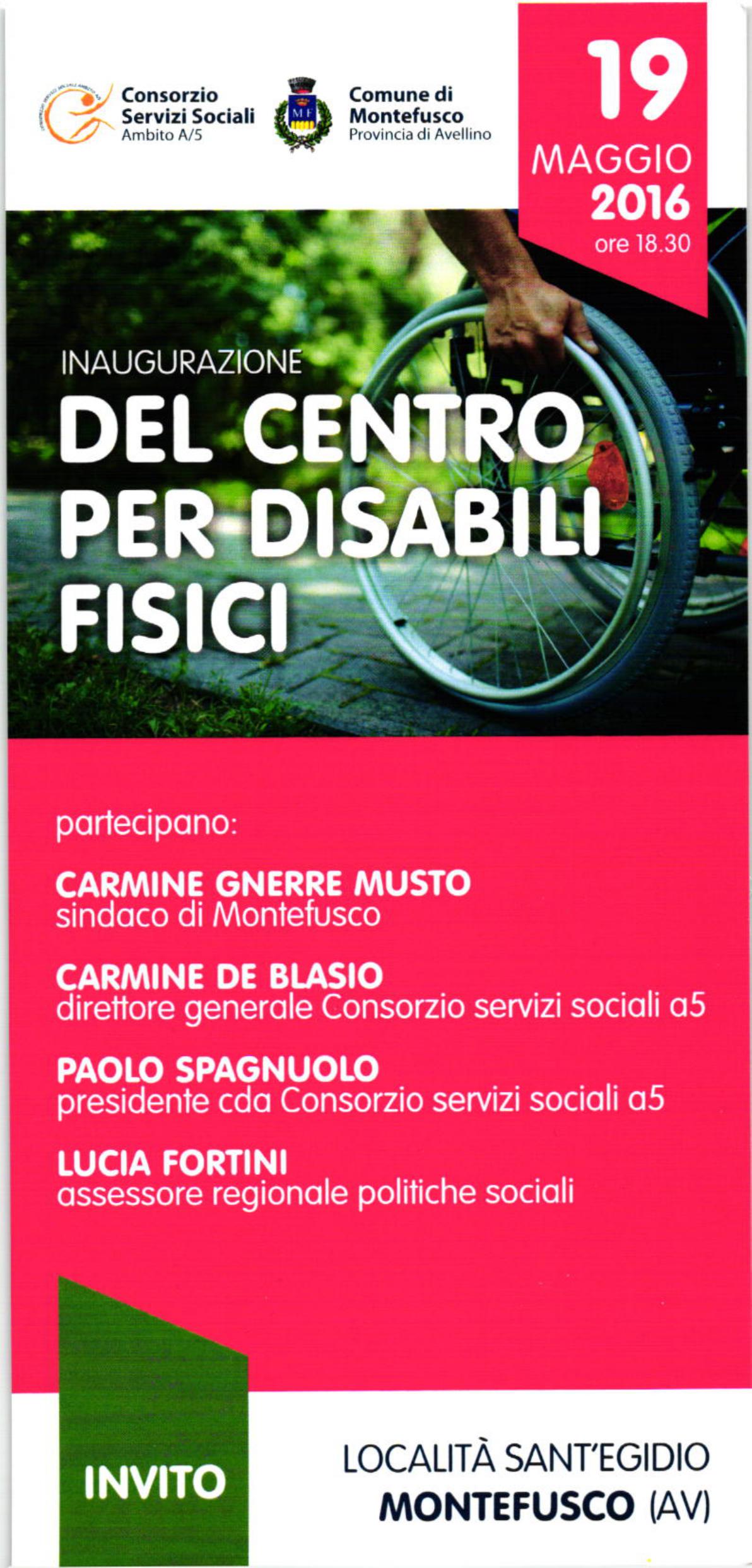 MONTEFUSCO – Si terrà giovedi 19 maggio alle ore 18,30 l’inaugurazione del centro per disabili fisici. Al taglio del nastro parteciperanno il Sindaco di Montefusco Carmine Gnerre Musto, il Direttore generale Consorzio Servizi Sociali a5 Carmine De Blasio, Paolo Spagnuolo Presidente Cda Consorzio Servizi Sociali a 5 e Lucia Fortini, Assessore regionale politiche sociali. L’appuntamento è in località Sant’Egidio.