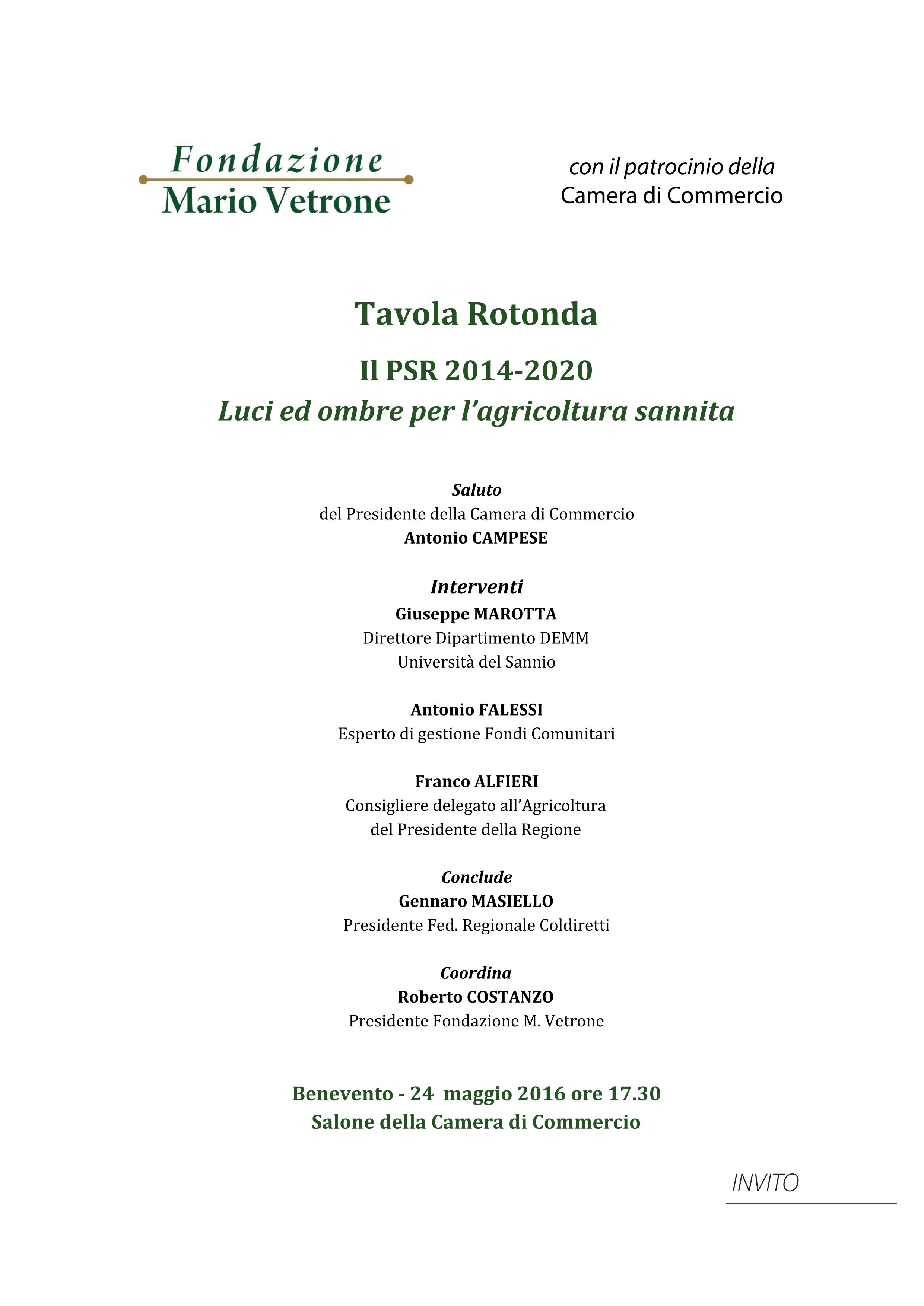 BENEVENTO – Si svolgerà questo pomeriggio alla Camera di Commercio la tavola rotonda dal tema “Luci ed ombre sull’agricoltura sannita” organizzata dalla Fondazione Mario Vetrone in collaborazione con Coldiretti. Interverranno il Presidente dell’ente camerale Antonio Campese, Giuseppe Marotta Direttore DEMM UNISANNIO, Antonio Falessi Esperto di gestione Fondi Comunitari e Franco Alfieri Consigliere delegato all’Agricoltura del Presidente della Regione Campania. Concluderà Gennaro Masiello, Presidente Federazione Regionale Coldiretti e Roberto Costanzo Presidente Fondazione Mario Vetrone. L’appuntamento è nella Salone alle ore 17: 30