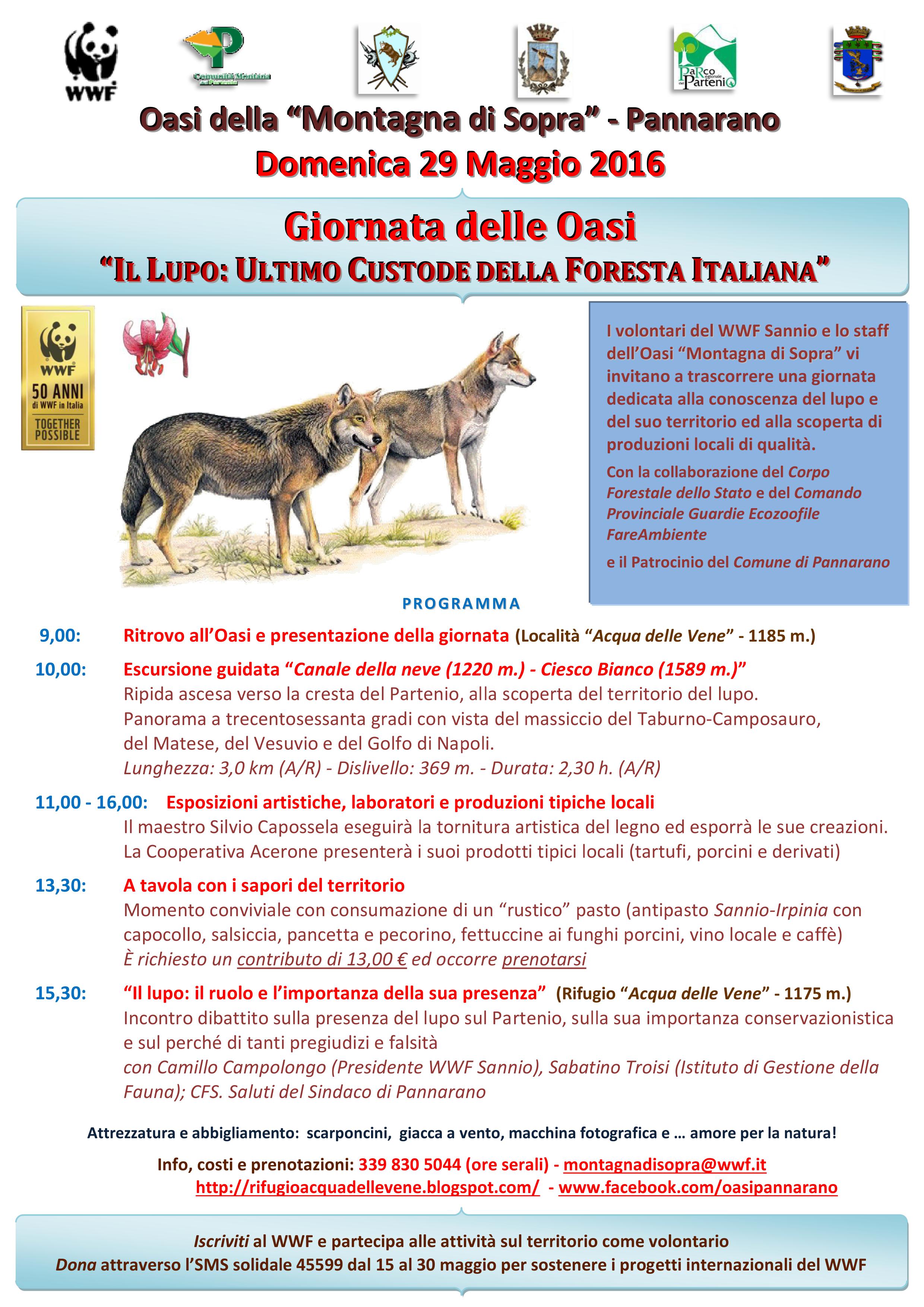 L’Oasi WWF “Montagna di Sopra” di Pannarano aderisce all’evento e sta organizzando una giornata ricca di iniziative; l’intera manifestazione sarà dedicata al Lupo ed al suo territorio, con escursioni sulla vetta del Partenio e approfondimenti sullo status di questo “ultimo custode della foresta”, ma anche esposizioni di produzioni locali di qualità e la degustazione di un rustico pasto del territorio.