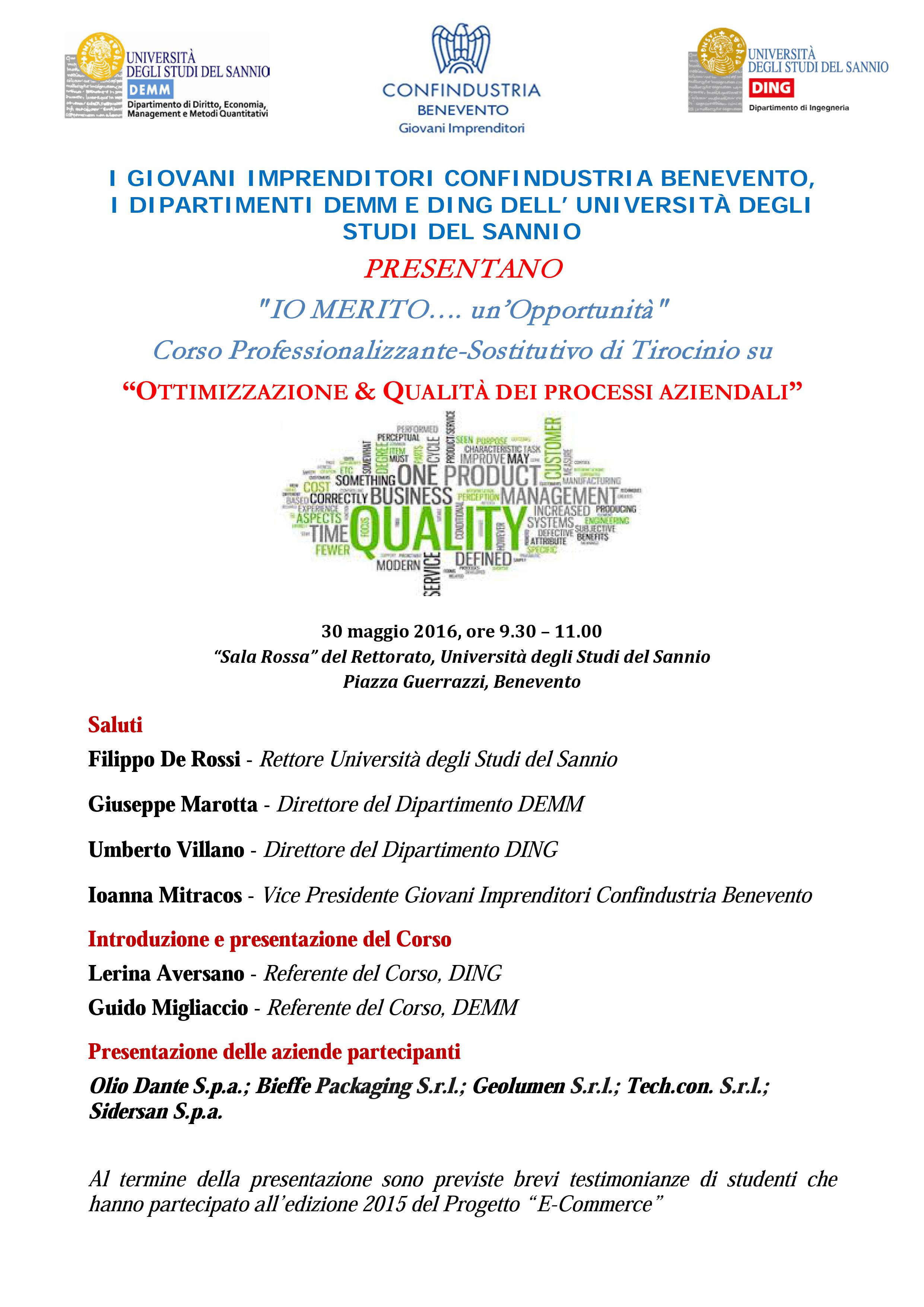 BENEVENTO – Lunedì 30 maggio, all’Università del Sannio (ore 9.30 – Sala Rossa Palazzo San Domenico) sarà presentata l’edizione 2016 di “IO MERITO…un’Opportunità”. Si tratta del corso professionalizzante-sostitutivo di tirocinio, giunto alla terza edizione e organizzato dai Giovani Imprenditori Confindustria Benevento e dai Dipartimenti DEMM e DING di Unisannio. Il tema di quest’anno è “OTTIMIZZAZIONE & QUALITÀ DEI PROCESSI AZIENDALI”.