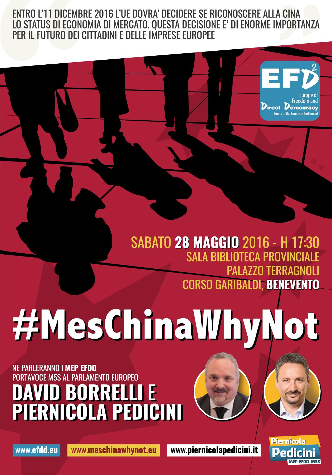 Un’iniziativa che mira a conoscere l’opinione dei cittadini e delle aziende per comprenderne il grado d’informazione e rispettarne l’esito. Attraverso il sito www.meschinawhynot.eu gli utenti europei (cittadini, aziende, professionisti) possono rispondere a dieci domande precise e dirette, alcune aperte altre chiuse. Il M5s Europa intende sapere se i cittadini europei vogliono o no che l’Ue conceda il riconoscimento dello status di economia di mercato alla Cina e se i cittadini italiani hanno compreso le gravi conseguenze a cui l’economia italiana andrà incontro se ciò avvenisse. Attorno a questa evenienza si è aperto un dibattito politico e giuridico. Tant’è che alcuni esperti ritengono che, il riconoscimento dello status di economia di mercato, non è automatico in relazione alla data di scadenza. Secondo il diritto comunitario europeo oggi la Cina non è un’economia di mercato, perché rispetta solo uno dei cinque criteri stabiliti dalla legislazione europea, per qualificare un’economia di mercato. La Commissione europea prevede tre scenari: 1) La Cina ottiene il riconoscimento dello status di economia di mercato; 2) La Cina ottiene il riconoscimento dello status di economia di mercato con l’adozione di misure compensative; 3) La Cina non ottiene il riconoscimento dello status di economia di mercato. Il Movimento 5 Stelle da quattro mesi sta girando l’Italia per informare i cittadini, raccogliere valutazioni e suggerimenti su tutte le possibili soluzioni che possono essere messe in campo. Di tutto questo si parlerà sabato 28 maggio a Benevento con i portavoce del M5s Piernicola Pedicini, che si soffermerà sul drammatico impatto ambientale e sanitario che potrebbe provocare il riconoscimento dello status di economia di mercato alla Cina, e con Davide Borrelli che è il promotore del “Mes China Tour”. All’evento parteciperanno anche la candidata sindaco Marianna Farese e i candidati del M5s al Comune di Benevento.
