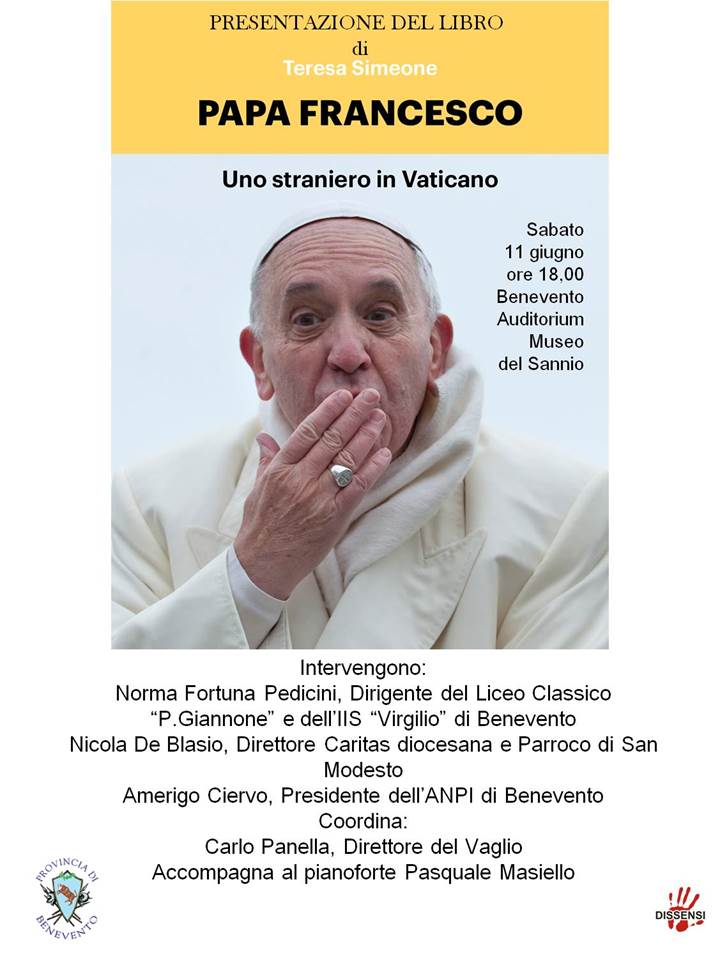 BENEVENTO – Sabato 11 giugno, alle 18, nell’Auditorium del Museo del Sannio sarà presentato, con il patrocinio morale della Provincia di Benevento, il libro di Teresa Simeone “Papa Francesco-uno straniero in Vaticano”. Interverranno: Norma Fortuna Pedicini, Dirigente del Liceo Classico “P. Giannone” e dell’IIS “Virgilio” di Benevento; Nicola De Blasio, Direttore Caritas diocesana e Parroco di San Modesto; Amerigo Ciervo, Presidente dell’ANPI di Benevento. Modererà: Carlo Panella, Direttore del Vaglio.it. Al pianoforte: Pasquale Masiello.