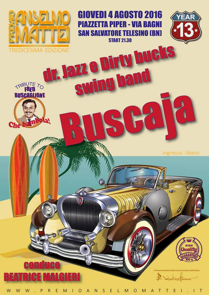 Se lo scorso anno ad esibirsi furono la Sassinfunky e Andrea De Balsi, l’edizione 2016 invece sarà arricchita dalla presenza dei Buscaja nato appunto in memoria di Buscaglione e dal musicista beneventano Dr. Jazz (Alfredo Verga) che sarà accompagnato anche da Alessandro Panella – Mr. Groove, Luciano De Ioanni – Mr. Chugga e Ettore Patrevita – Mr. Dirty, ovvero: la Dirty Bucks Swing Band. Dal primo concerto in solo di “Dr. Jazz” (maggio 2014) il progetto, diventato poi una band, è riuscito ad imporsi all’attenzione del pubblico, affermandosi come uno dei più seguiti ed apprezzati della Campania; oltre 250 esibizioni dal vivo, alcune in veri e propri templi del Jazz come il “Cotton Club” a Roma e lo “Spirit de Milan” a Milano.