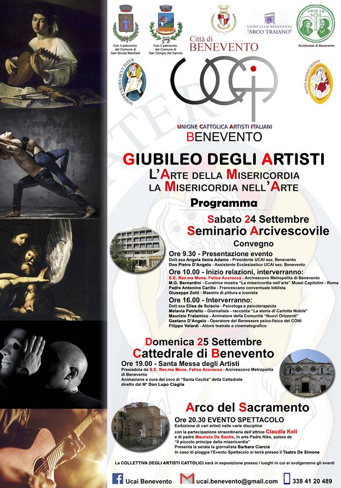 L’UCAI Benevento, presenta, in occasione del Giubileo degli artisti, l’evento “La misericordia dell’arte, l’arte nella misericordia” con un programma ricco di incontri divisi in due giornate. Sabato 24 settembre 2016 dalle ore 9:00, fino al completamento dei lavori, presso l’ Auditorium del Seminario Arcivescovile di Benevento, in Viale Atlantici 69, si terrà un convegno a cui interverrà – tra gli altri – S.E. Rev.ma Mons. Felice Accrocca, e domenica 25 settembre 2016 alle ore 19:00 presso la cattedrale metropolitana di Santa Maria de Episcopio, sarà celebrata la Santa Messa; alle ore 20:45 presso l’ arco del Sacramento che sormonta via Carlo Torre, si alterneranno vari artisti in un evento – spettacolo che sarà arricchito dalla partecipazione straordinaria di Claudia Koll, e Maurizio de Santis – in arte padre Nike. In entrambe le giornate sarà, inoltre, allestita una collettiva presso l’Auditorium del Seminario Arcivescovile e poi presso la Basilica di San Bartolomeo in Piazza Federico Torre corso Garibaldi 82100 Benevento, a cura di artisti ed iconisti che ripongono nelle loro opere una spiritualità e una forza disarmanti.