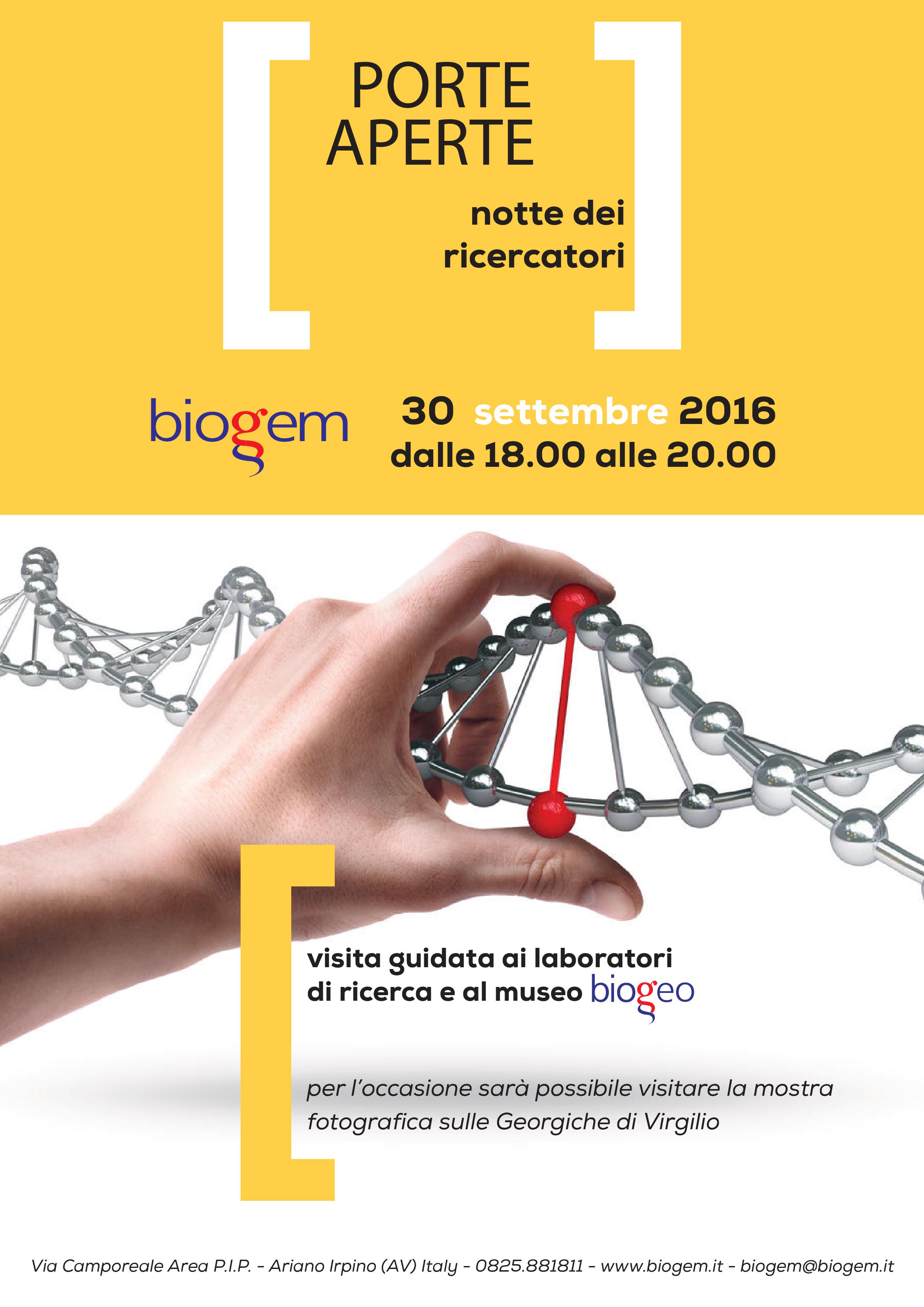 La Notte Europea dei Ricercatori si svolge ogni anno l’ultimo venerdì di settembre contemporaneamente in oltre 200 città europee.  In tale occasione Biogem aprirà le porte dei propri laboratori e del Museo Biogeo dalle 18.00 alle 20.00 ai visitatori esterni con percorsi guidati.