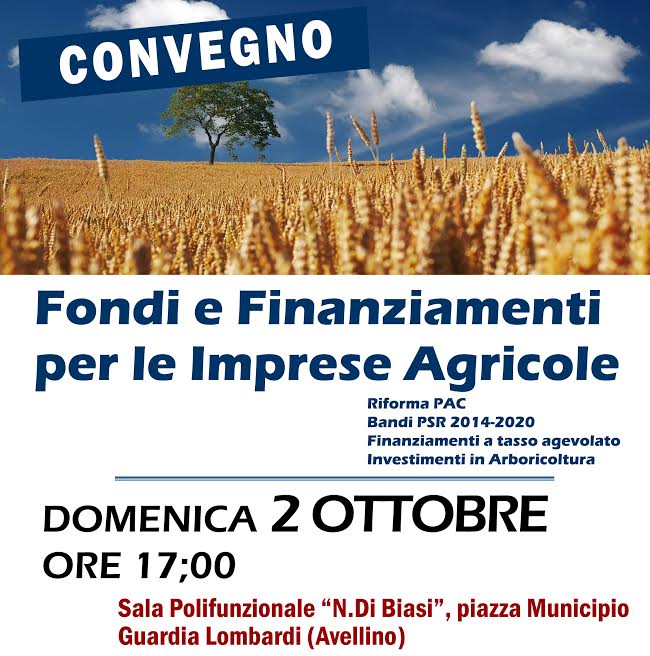 GUARDIA LOMBARDI – “Fondi e Finanziamenti per le imprese Agricole” è il titolo del convegno che si terrà domenica 2 ottobre alle ore 17:00 nella sala polifunzionale “N. Di Biasi”. L’incontro è rivolto alle imprese agricole e a giovani imprenditori che intendono sfruttare al meglio i bandi appena attivati dal PSR 2014-2020 e conoscere gli strumenti di finanza agevolata.In un momento di forte carenza delle risorse pubbliche e di difficoltà occupazionale, i fondi europei svolgono un ruolo fondamentale per lo sviluppo rurale e per arginare il crescente abbandono delle aree interne.