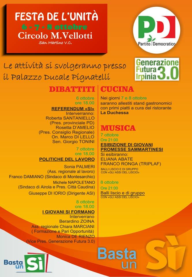 foto-referendumS. MARTINO V.C. – Il circolo Pd “Martino Vellotti” organizza la Festa de l’Unità. Le date in programma sono il 6, 7  e 8 ottobre presso il Palazzo Ducale Della Leonessa-Pignatelli. Il tema scelto è il Referendum per la riforma costituzionale.