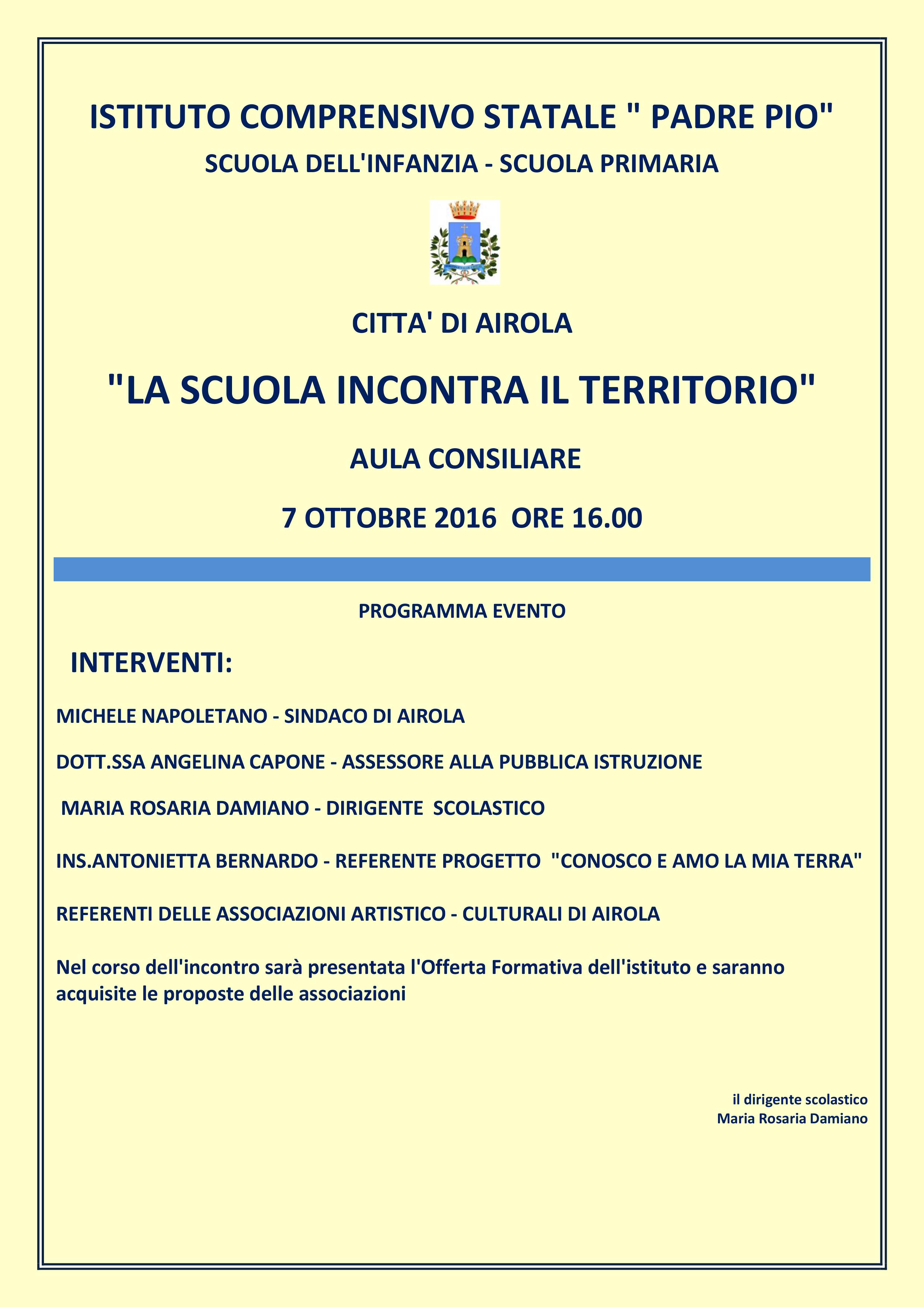 AIROLA- E’ in programma venerdì 7 ottobre alle ore 16 presso l’Istituto comprensivo statatale “Padre Pio” l’appuntamento “La scuola incontra il territorio”. Ad intervenire il Sindaco Michele Napoletano, la dott.ssa Angelica Capone Assessore alla Pubblica Istruzione, Maria Rosaria Damiano Dirigente scolastica, Antonietta Bernardo Referente Progetto “conosco e amo la mia terra” e referenti delle associazioni artistico-culturali di Airola. Nell’incontro inoltre sarà presentata l’offerta formativa scolastica e saranno acquisite le proposte delle associazioni.