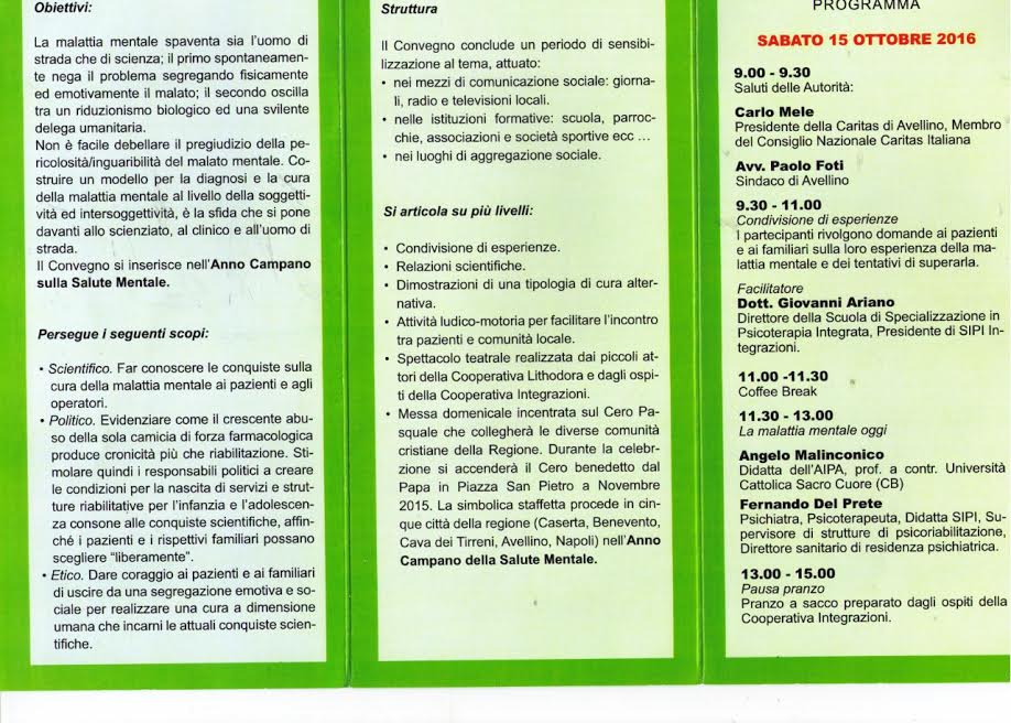 Sabato 15 ottobre, alla Camera di Commercio di Avellino, e domenica 16, nella Chiesa di Santa Maria delle Grazie, studiosi ed esperti di fama nazionale affronteranno uno dei temi di maggiore attualità, la patologia mentale, per creare una sensibilità moderna e una capacità di integrazione, che favorisca il reinserimento e il recupero dei pazienti che ne sono affetti.