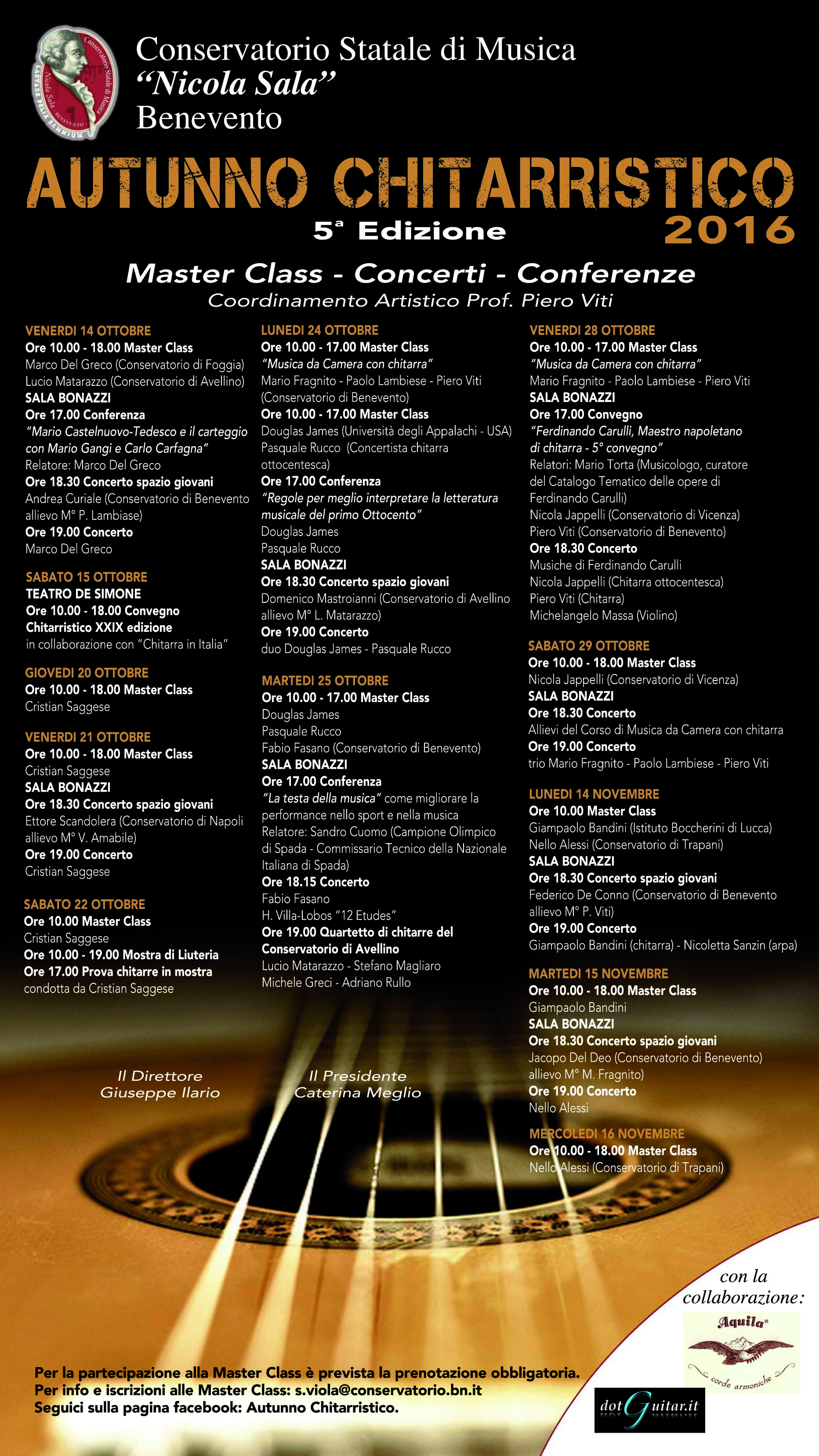 La manifestazione apre di fatto la quinta edizione dell’Autunno Chitarristico organizzato dal Conservatorio “Nicola Sala”, manifestazione dedicata alla sei corde ideata e coordinata artisticamente dal M° Piero Viti, docente titolare della cattedra di chitarra dell’Istituto di Alta Formazione Musicale sannita. Il progetto proporrà, secondo una formula ormai collaudata, masterclass, conferenze e concerti che si svolgeranno dal 14 ottobre al 16 novembre presso le sale del Conservatorio con numerosi ospiti d’eccezione, tra cui docenti e concertisti di grande rilievo sulla scena chitarristica italiana ed internazionale. La manifestazione si avvarrà inoltre della collaborazione di Aquila Corde Armoniche e del web magazine “dotGuitar”.