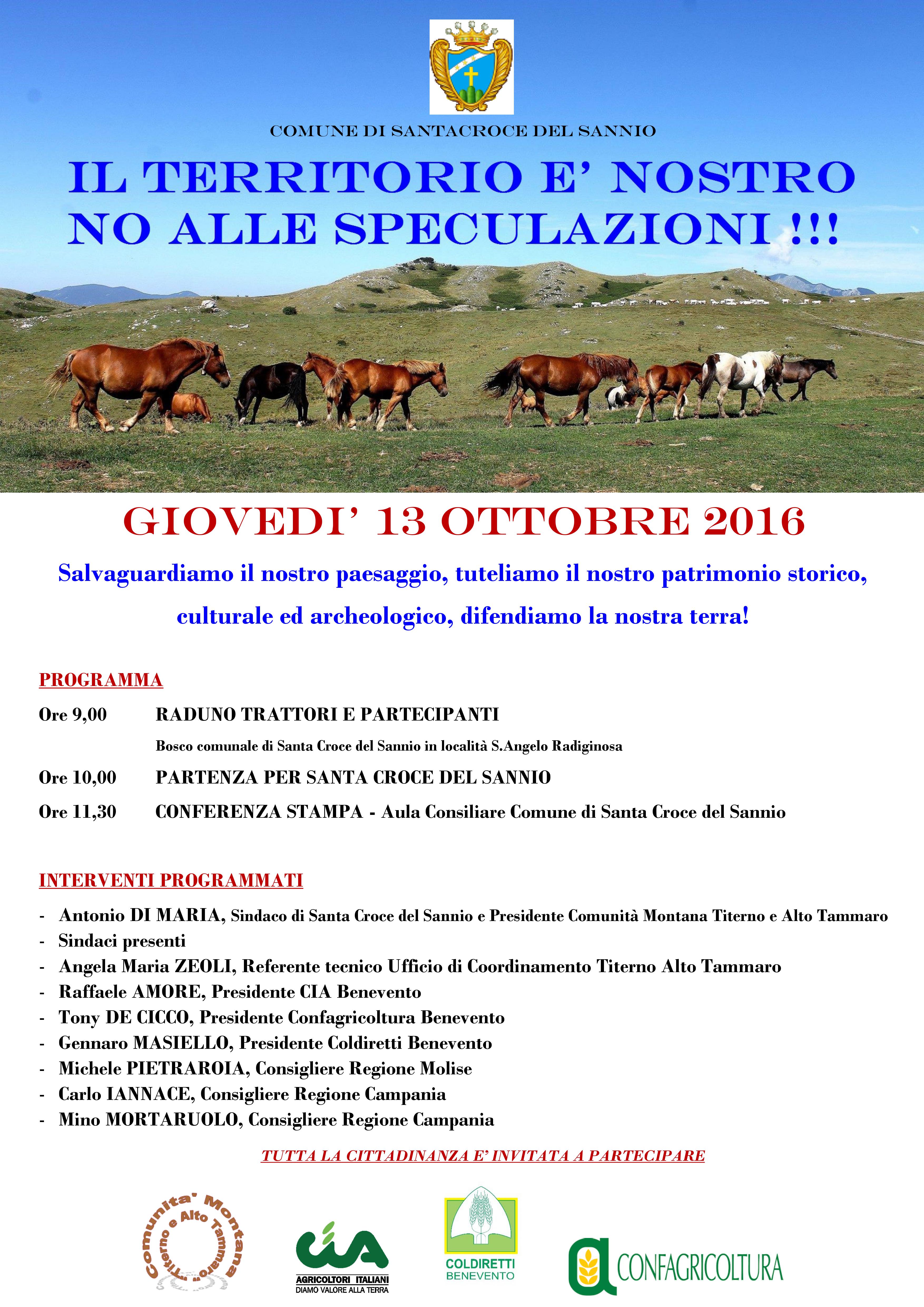 Giovedi’ 13 ottobre 2016 si terrà la manifestazione “Il territorio è nostro, no alle speculazioni”. Sottotitolo: salvaguardiamo il nostro paesaggio, tuteliamo il nostro patrimonio storico, culturale ed archeologico, difendiamo la nostra terra. Ad organizzarla il Comune di Santa Croce insieme alle principali associazioni di categoria Coldiretti, Cia e Confagricoltura, con la partecipazione della Comunità Montana Titerno e Alto Tammaro.