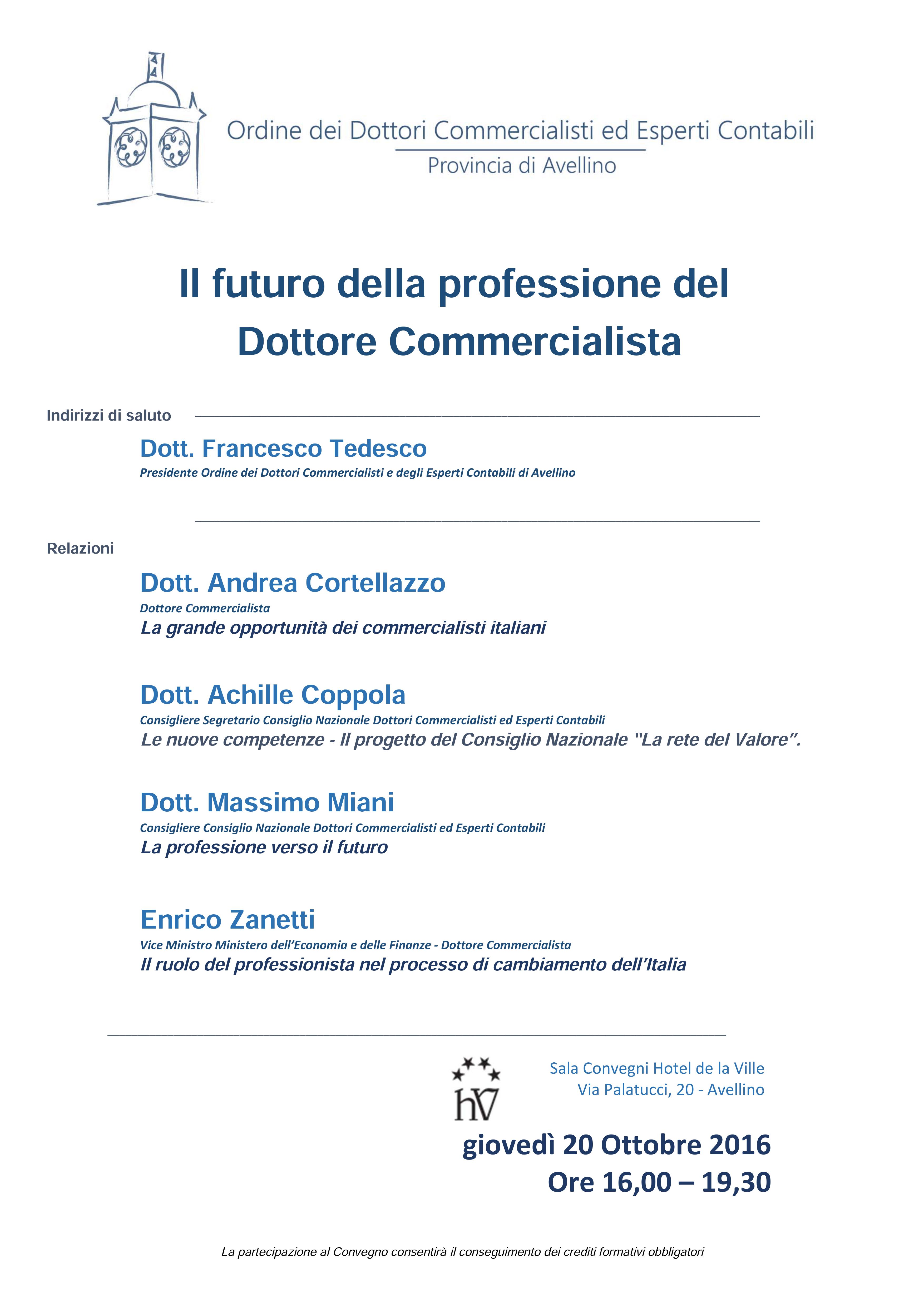AVELLINO – “Il futuro della professione del dottore commercialista”: questo il tema dell’importante convegno organizzato dall’Ordine dei Dottori Commercialisti e degli Esperti Contabili di Avellino, fortemente voluto dal presidente Francesco Tedesco, in programma giovedì 20 ottobre all’hotel de La Ville. Previsto l’intervento, tra gli altri, di Enrico Zanetti, vice Ministro dell’Economia e delle Finanze, dottore commercialista, il quale relazionerà sul ruolo del professionista nel processo di cambiamento dell’Italia. Dopo i saluti di Tedesco, le relazioni saranno affidate ad autorevoli esponenti dell’Ordine dei Commercialisti: Andrea Cortellazzo; Achille Coppola, segretario consiglio nazionale; Massimo Miani, consigliere nazionale con delega alla formazione. Le conclusioni saranno affidate all’onorevole Zanetti. Il Convegno si terrà, come detto, giovedì 20 ottobre dalle 16 alle 19.30.
