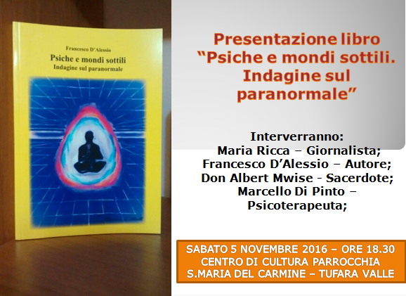 TUFARA VALLE – Sabato 5 novembre 2016, alle ore 18.30, presso il Centro di Cultura della parrocchia Santa Maria del Carmine di Tufara Valle, in via Nazionale Appia, la presentazione del libro , del giovane scrittore sannita Francesco D’Alessio. Introdurrà il parroco, don Albert Mwise. Interverrà, oltre all’autore, Marcello Di Pinto, psicologo – psicoterapeuta. Coordinerà la giornalista Maria Ricca.