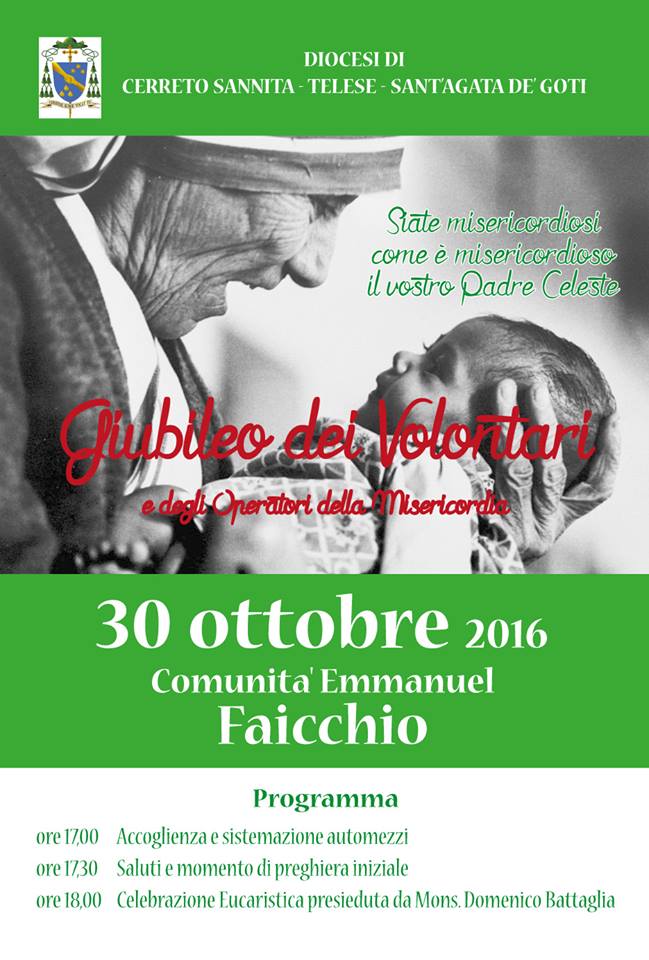 Al termine di quest’anno giubilare, prima della chiusura prevista per domenica 13 novembre nella chiesa Cattedrale di Cerreto Sannita, ci sarà un ultimo appuntamento diocesano, non certamente ultimo per importanza, e cioè un Giubileo dei Volontari e degli Operatori della Misericordia per questa domenica 30 ottobre ore 17 presso la Comunità Emmanuel a Faicchio (ex convento francescano di San Pasquale). In tale occasione il vescovo don Mimmo Battaglia incontrerà tutti i gruppi e le associazioni di volontariato della nostra Diocesi, con i loro mezzi, divise e colori, che, pur nella loro diversità, sono uniti dalle azioni di solidarietà.