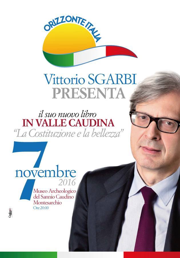 MONTESARCHIO – “La Costituzione e la bellezza” questo l’ultimo libro di Vittorio Sgarbi che presenterà in Valle Caudina. L’appuntamento è per il 7 novembre presso il Museo archeologico del Sannio caudino sito a Montesarchio, a partire dalle 20:00. L’evento è organizzato dall’associazione politico- culturale “Orizzonte Italia” fondata dal giovane imprenditore Christian Cambareri.
