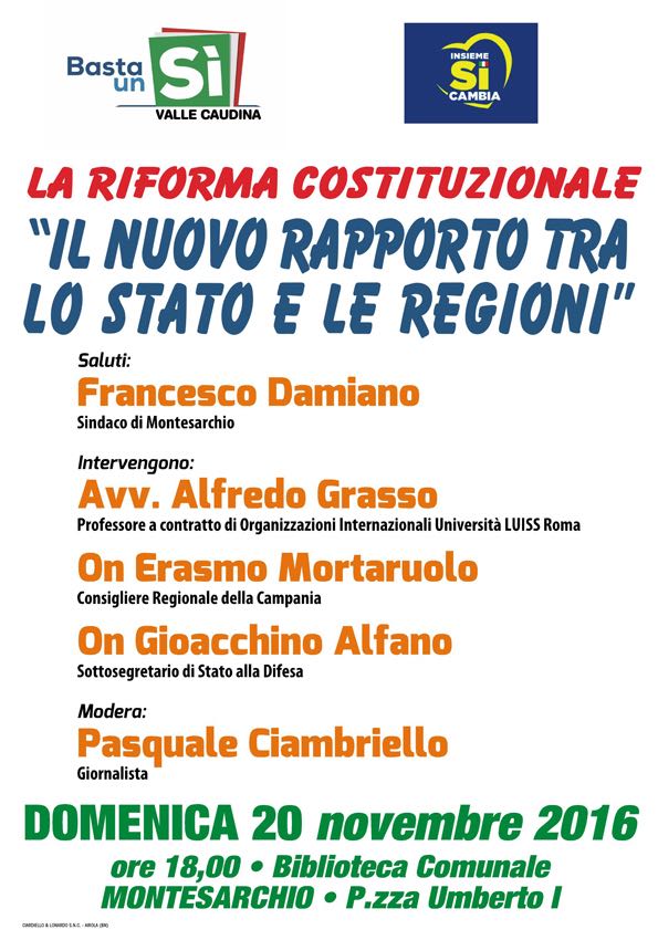 Il comitato Basta un Sì Valle Caudina, in sinergia con il comitato nazionale Insieme Si Cambia, organizza e promuove per domenica 20 novembre, alle 18, presso la Biblioteca comunale di Montesarchio, un dibattito in vista del referendum previsto per il 4 dicembre prossimo.