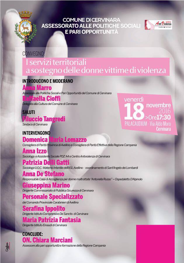 CERVINARA – “I servizi territoriali a sostegno delle donne vittime di violenza” questo l’argomento che si tratterà nel dibattito a Cervinara. L’appuntamento è per venerdì 18 novembre presso il Palacaudium a partire dalle 17:30. Introdurranno i lavori Anna Marro assessore alle Politiche sociali e Pari opportunità e Raffaella Cioffi delegata alla Cultura. Ci saranno i saluti del sindaco Filuccio Tangredi ed interverranno Domenica Lo Mazzo consigliera di Parità Provincia di Avellino, Anna Izzo assistente sociale del Pdz A4, Patrizia Delli Gatti Sociologa materna infantile dell’Asl Avellino, Anna De Stefano Responsabile casa di accoglienza “Antonella Russo”, Giuseppina Marino Dirigente commisssariao e pubblica sicurezza di Cervinara, Serafina Ippolito Dirigente Istituto comprensivo De Sanctis, Maria Patrizia Fantasia. Le conclusioni saranno affidate all’assessore regionale alle Pari opportunità Chiara Marciani.