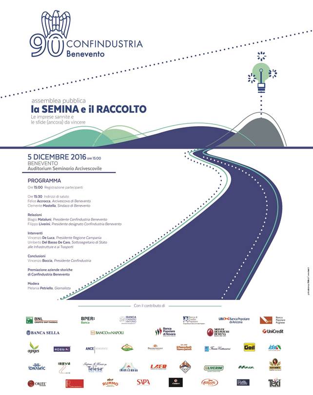 Il prossimo 5 dicembre 2016 al Seminario Arcivescovile a partire dalle 15:00 si terrà l’assemblea pubblica di Confindustria Benevento dal titolo: “La SEMINA E IL RACCOLTO. Le imprese sannite e le sfide (ancora) da vincere”.assemblea pubblica di Confindustria Benevento dal titolo: “La SEMINA E IL RACCOLTO. Le imprese sannite e le sfide (ancora) da vincere”.