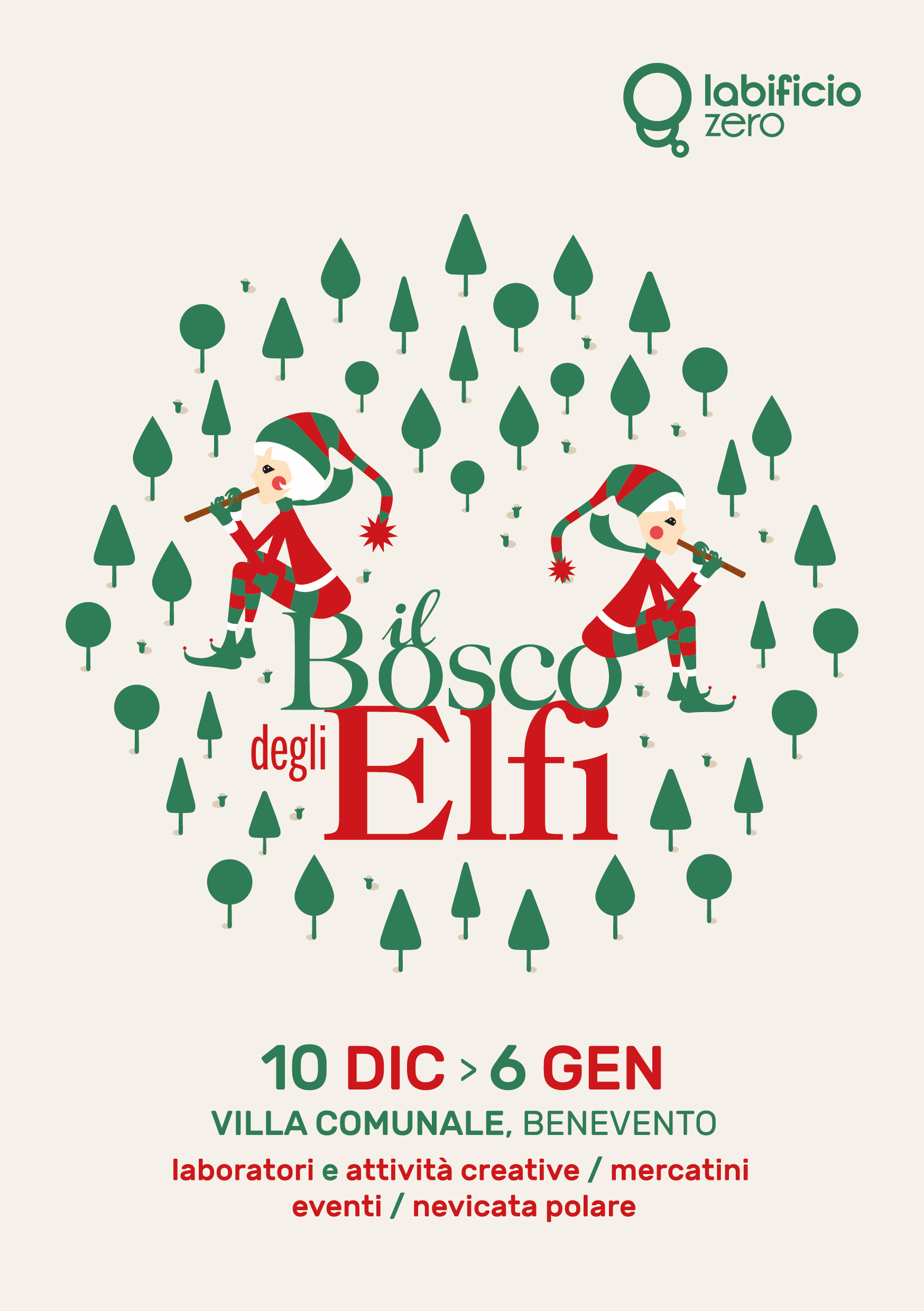 def_a5-fronte-retro-01Per la prima volta a Benevento, ad animare il programma natalizio della città, arriva “Il Bosco degli elfi”, a cura dell’impresa di promozione territoriale Labificio Zero. Fino al prossimo 6 gennaio la Villa comunale si trasformerà in un luogo incantato, uno scenario suggestivo, dove i bambini ma anche gli adulti, potranno scoprire i segreti del Natale, respirare l’atmosfera natalizia tra le vie alberate, incontrare gli elfi ed emozionarsi sotto la Nevicata Polare.
